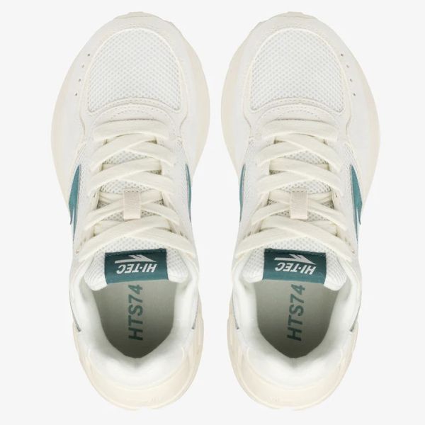 - Der weiße Turnschuh von Hi-Tec ist aus Leder und Textil gefertigt
