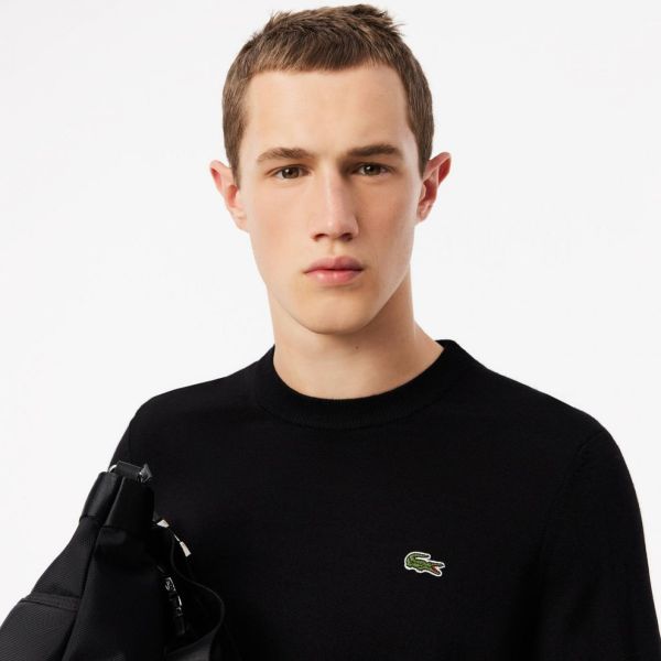 • Lacoste Pullover in schwarzer Farbe ist aus Wolle und Polyester.