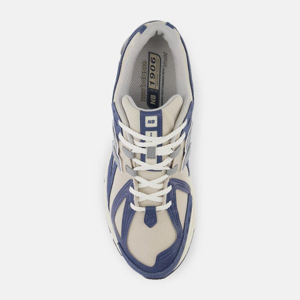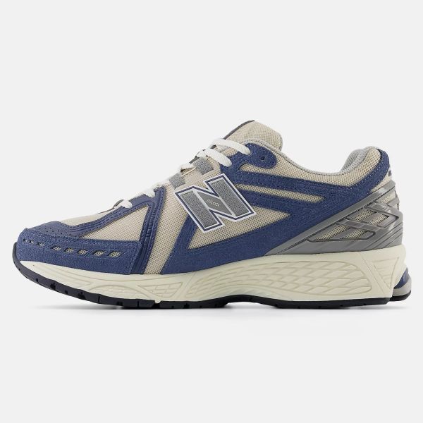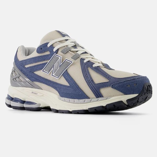 • Der Sneaker von New Balance in Off-White und Blau ist aus Leder, Textil und Gummi gefertigt.