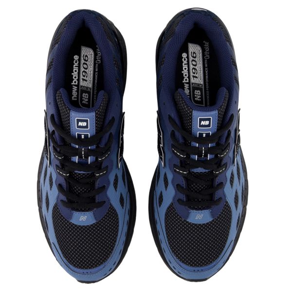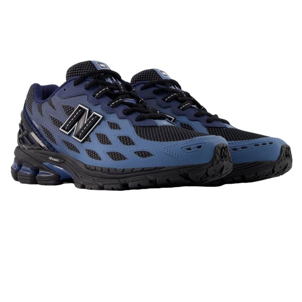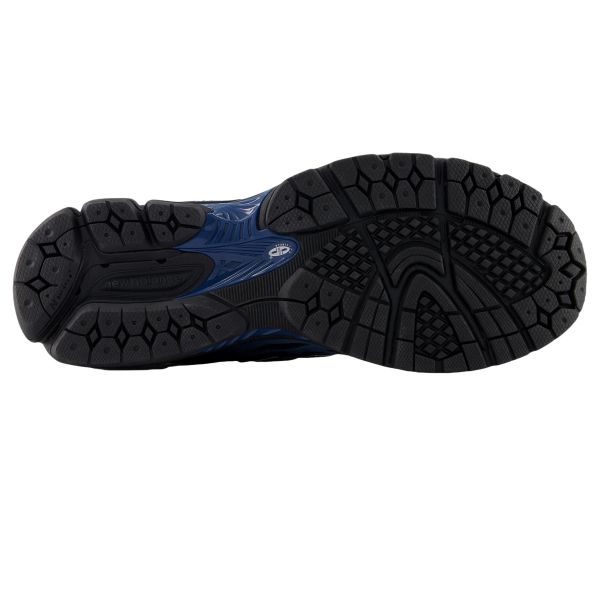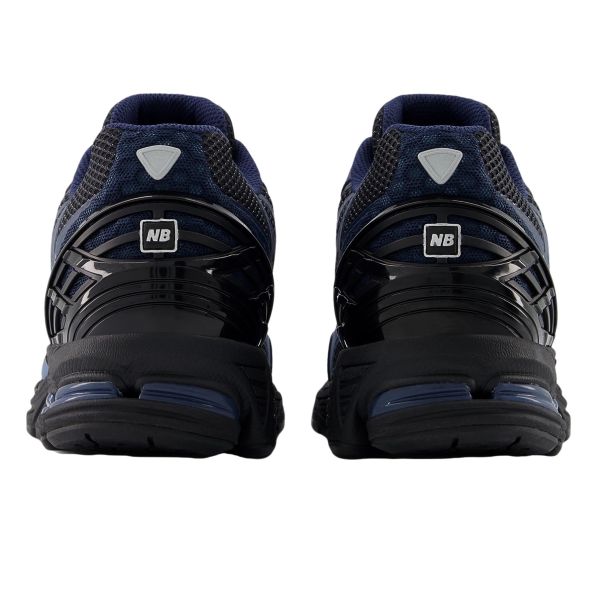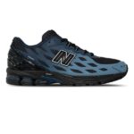 • New Balance's Trainer in schwarz und blau ist aus Leder, Textil und Gummi.