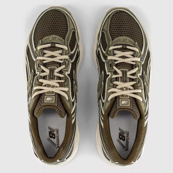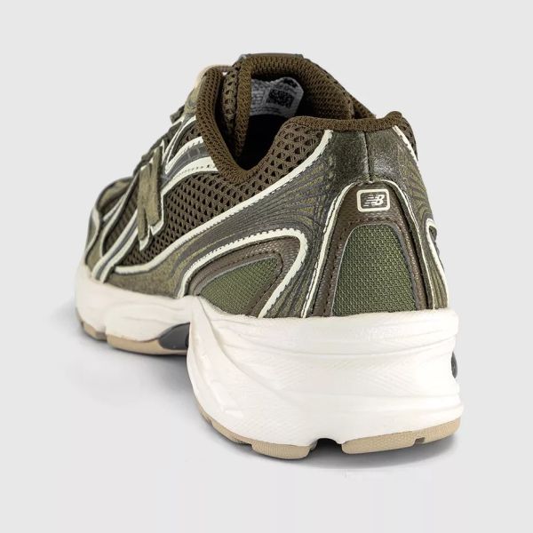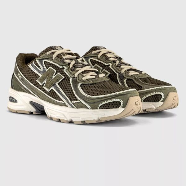 - Der dunkelgrüne Turnschuh von New Balance ist aus Leder, Textil und Gummi gefertigt.