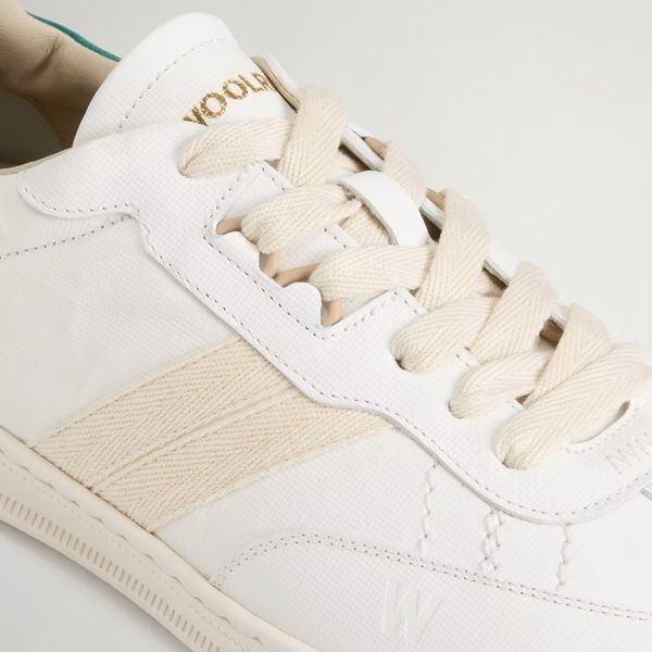 • Der Trainer von Woolrich in weißer Farbe ist aus Leder gefertigt.