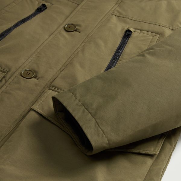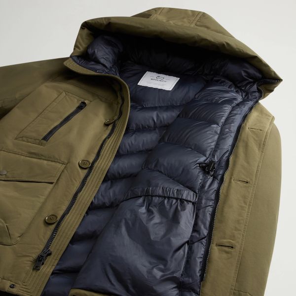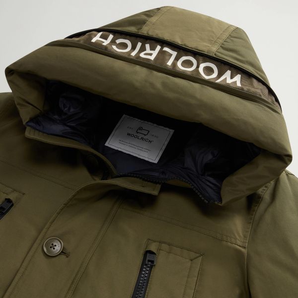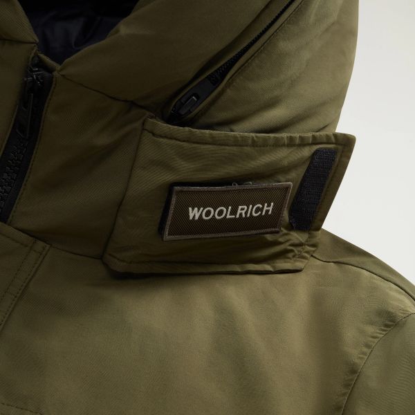 • Kapuze mit Reißverschluss, in der das Woolrich-Logo versteckt ist.